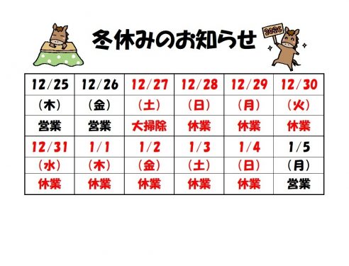 12/28(日)~ 1/4(日)までお休みをいただきます。